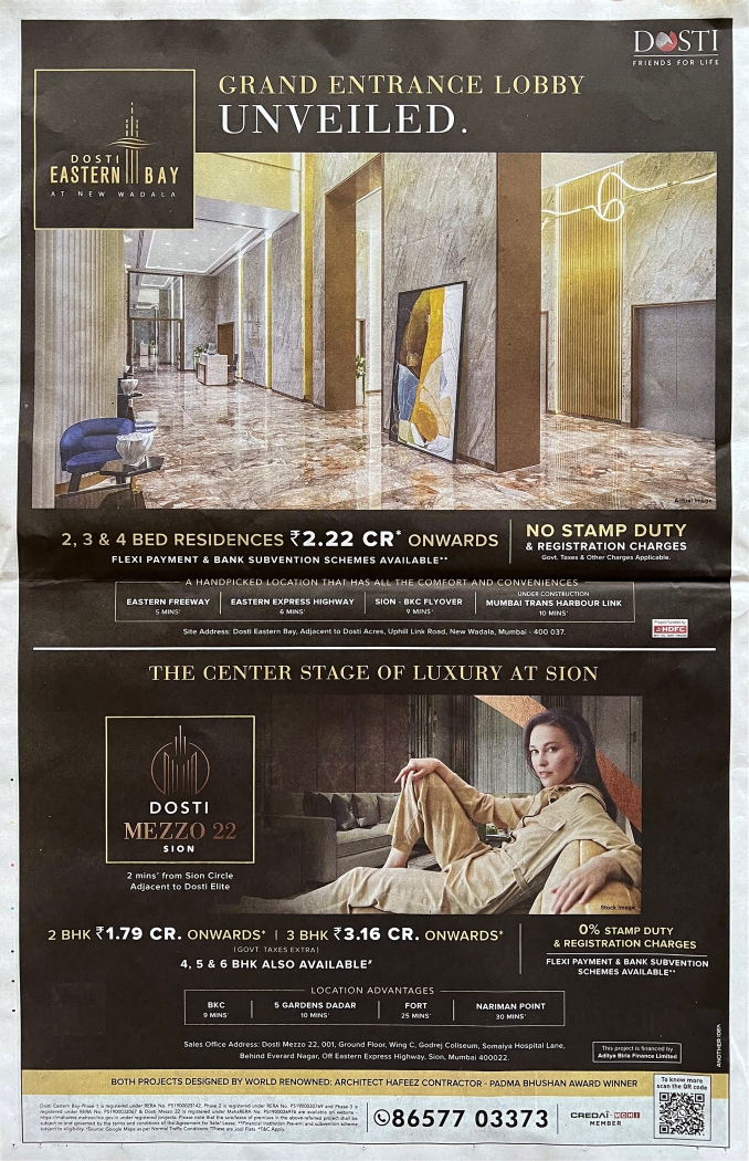 Today you will be happy to see Elaura Art Gallery’s artwork in the enormous display ad of Dosti Eastern Bay Wadala, capturing an entire page of today’s THE TIMES OF REAL ESTATE