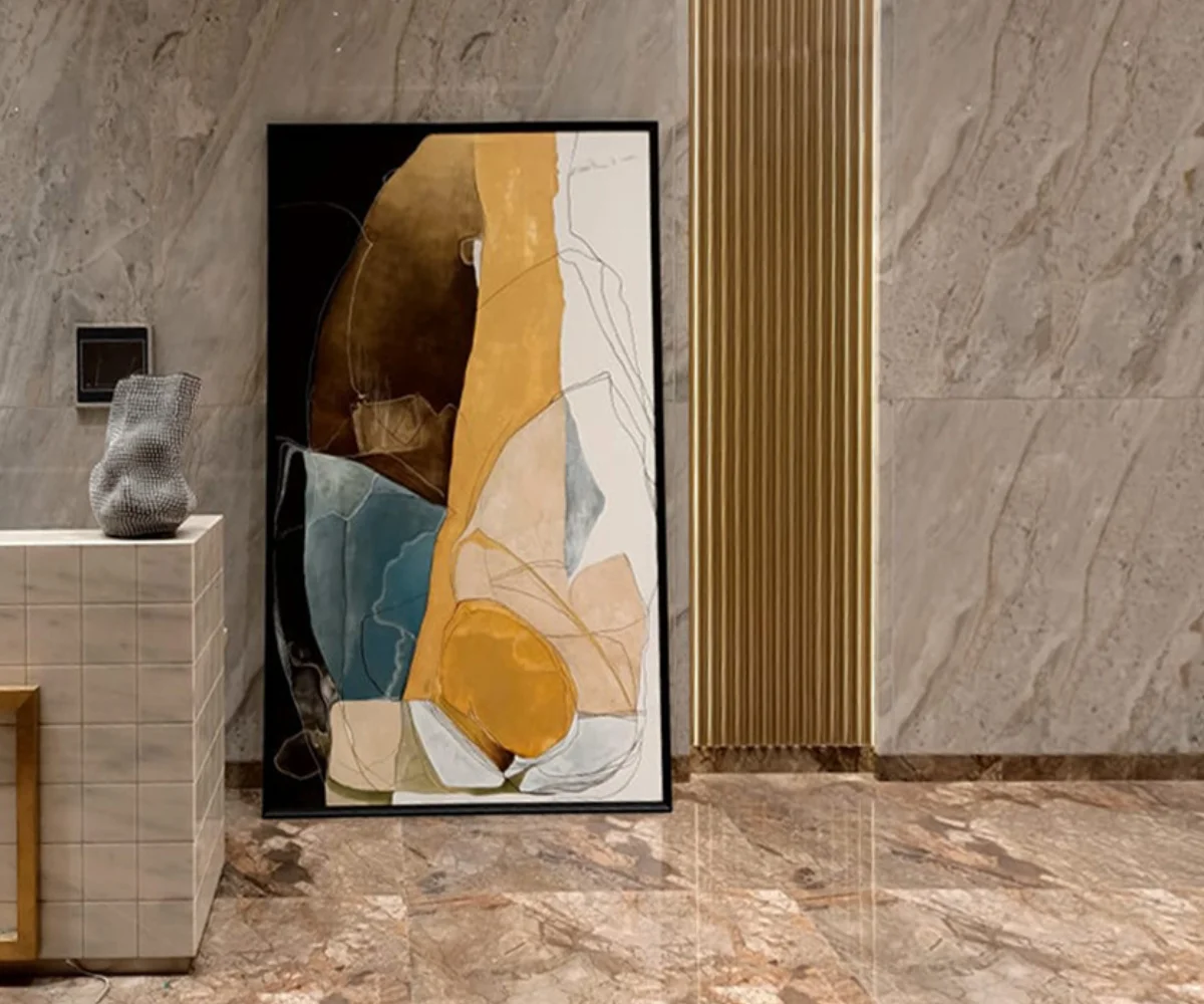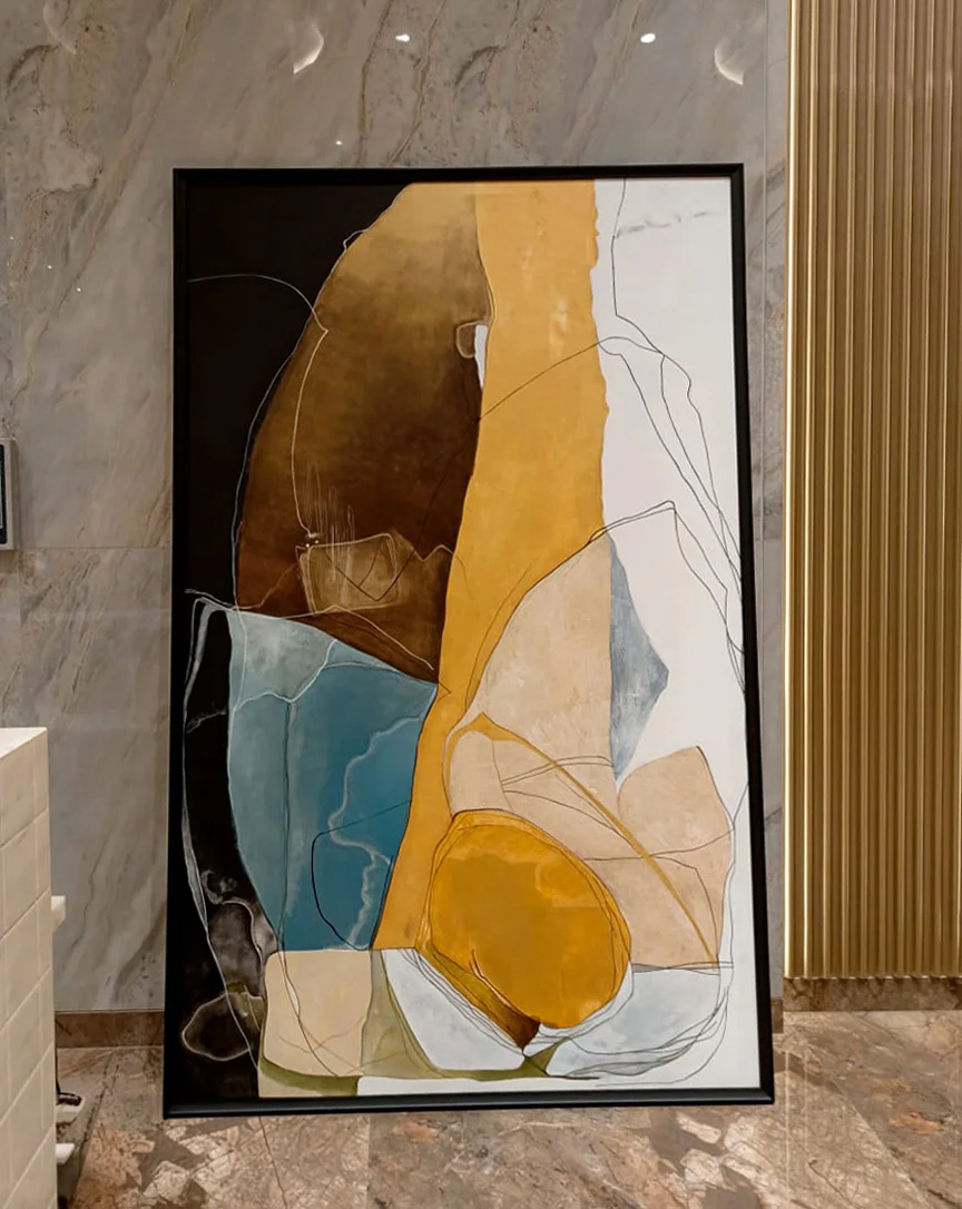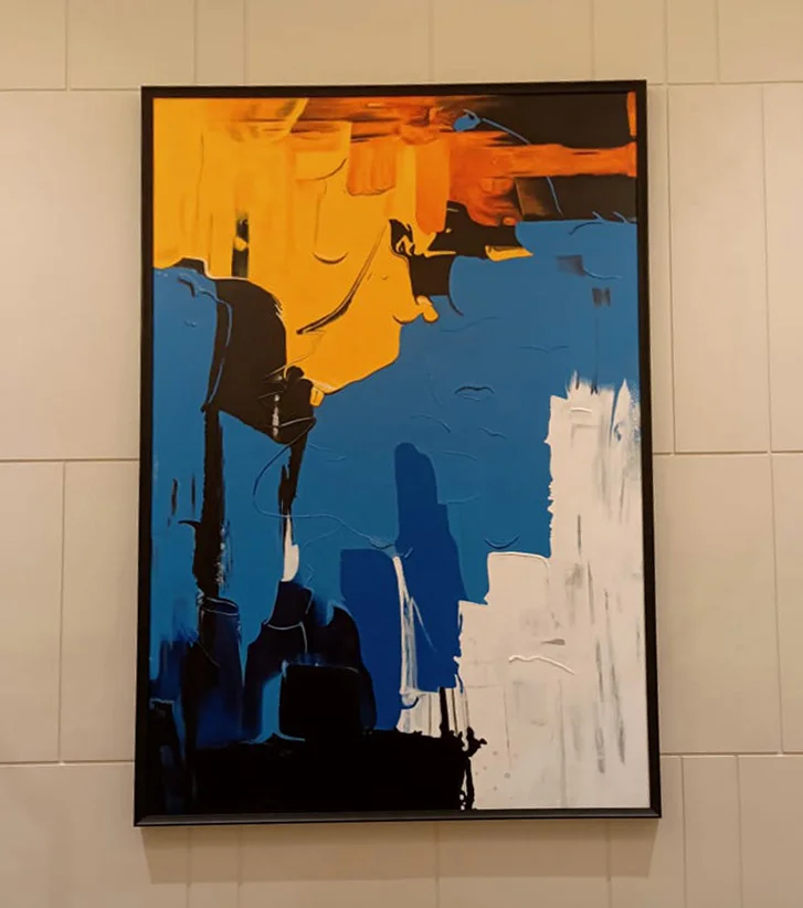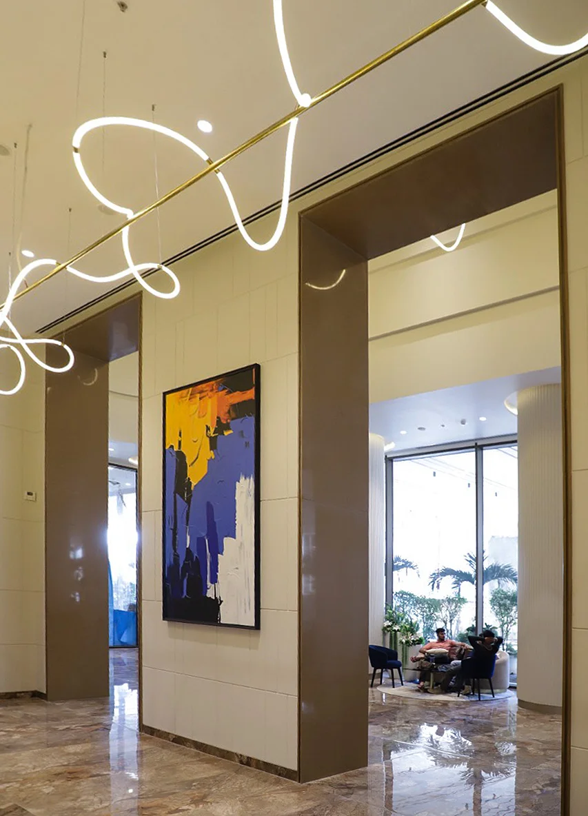 DESCRIPTION: Our art curation for the sales office at Dosti Realty Limited, Wadala, has been designed to create an atmosphere of sophistication and inspiration. The space features large-scale abstract paintings that command attention and leave a lasting impression on every visitor. These bold works not only enhance the visual appeal of the office but also reflect the creative spirit and forward-thinking vision of Dosti Realty.
