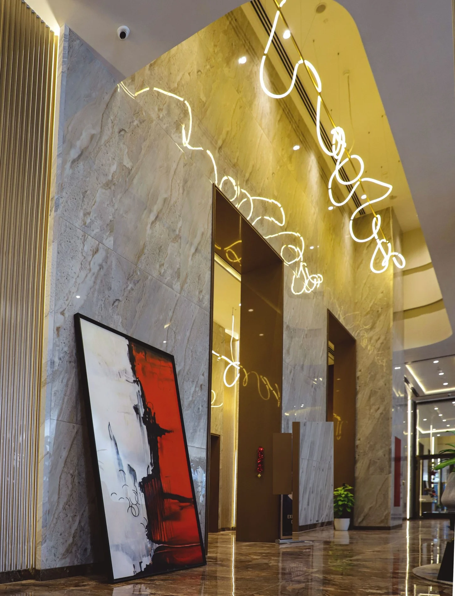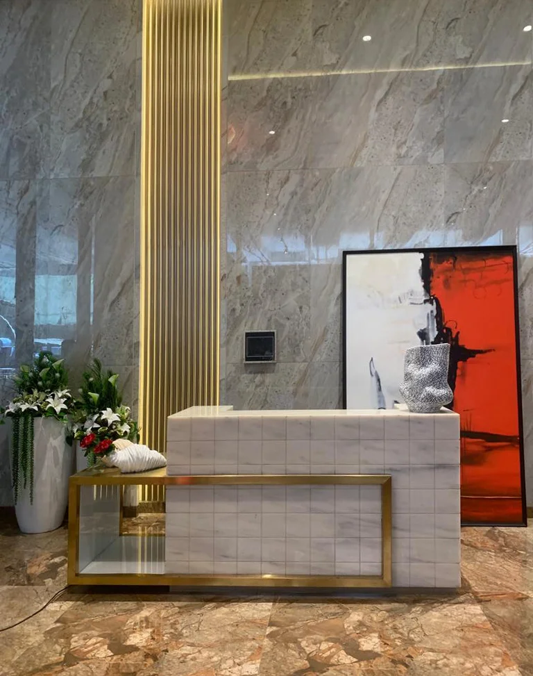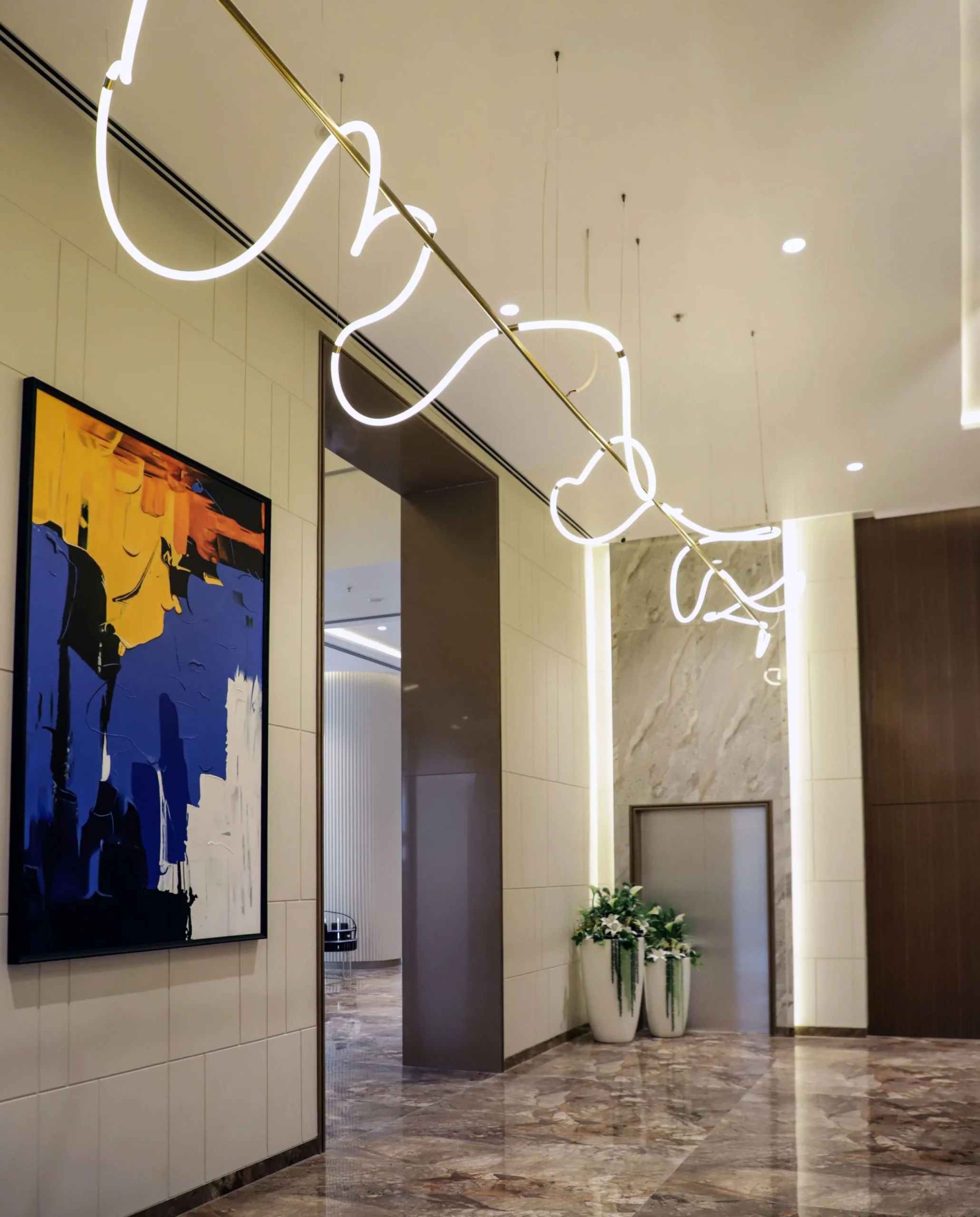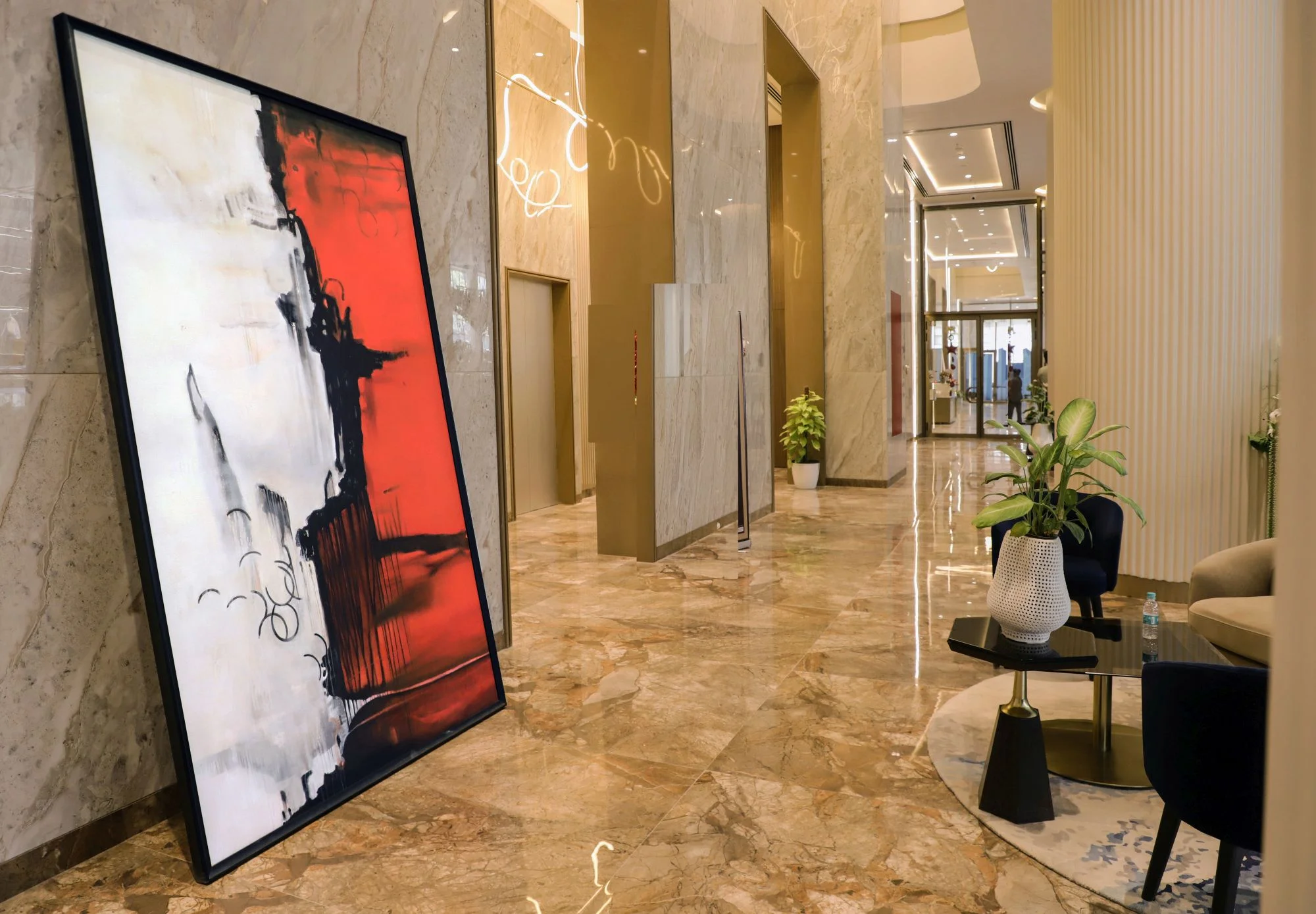 DESCRIPTION: Our art curation for the sales office at Dosti Realty Limited, Wadala, has been designed to create an atmosphere of sophistication and inspiration. The space features large-scale abstract paintings that command attention and leave a lasting impression on every visitor. These bold works not only enhance the visual appeal of the office but also reflect the creative spirit and forward-thinking vision of Dosti Realty.