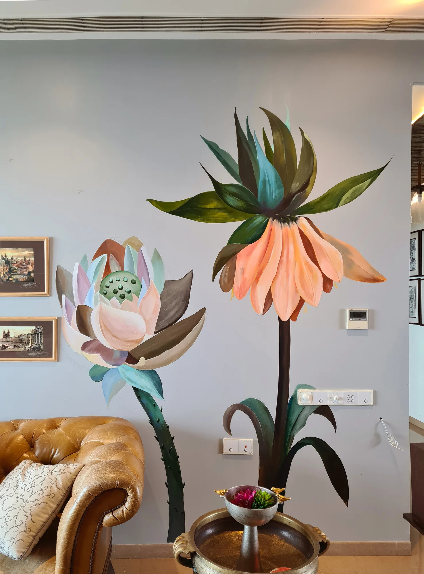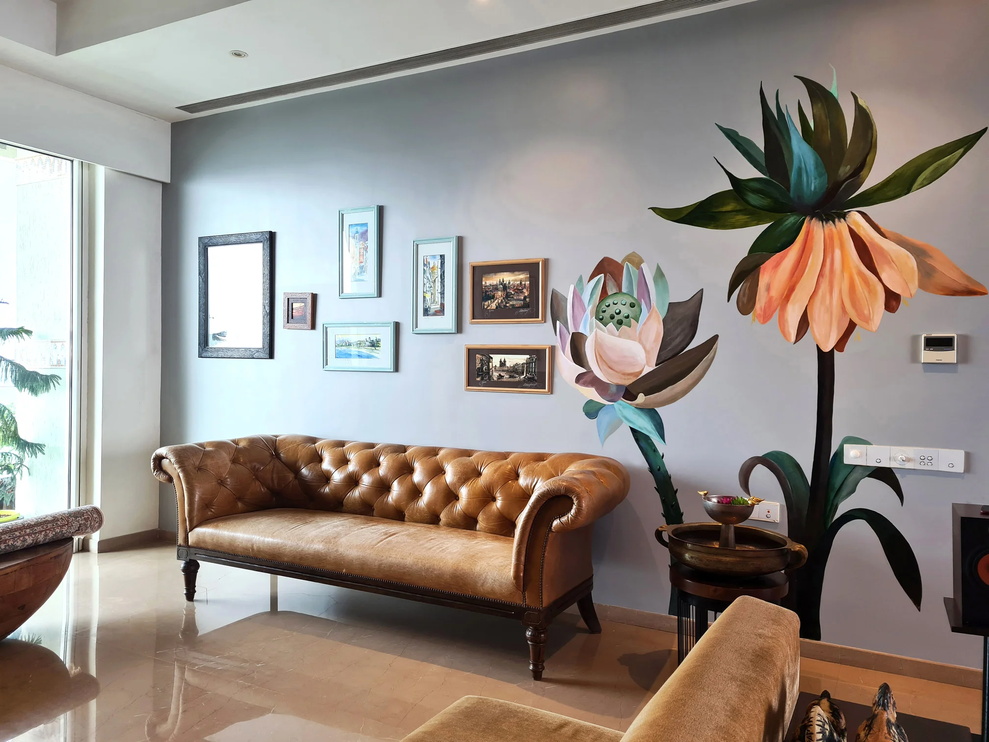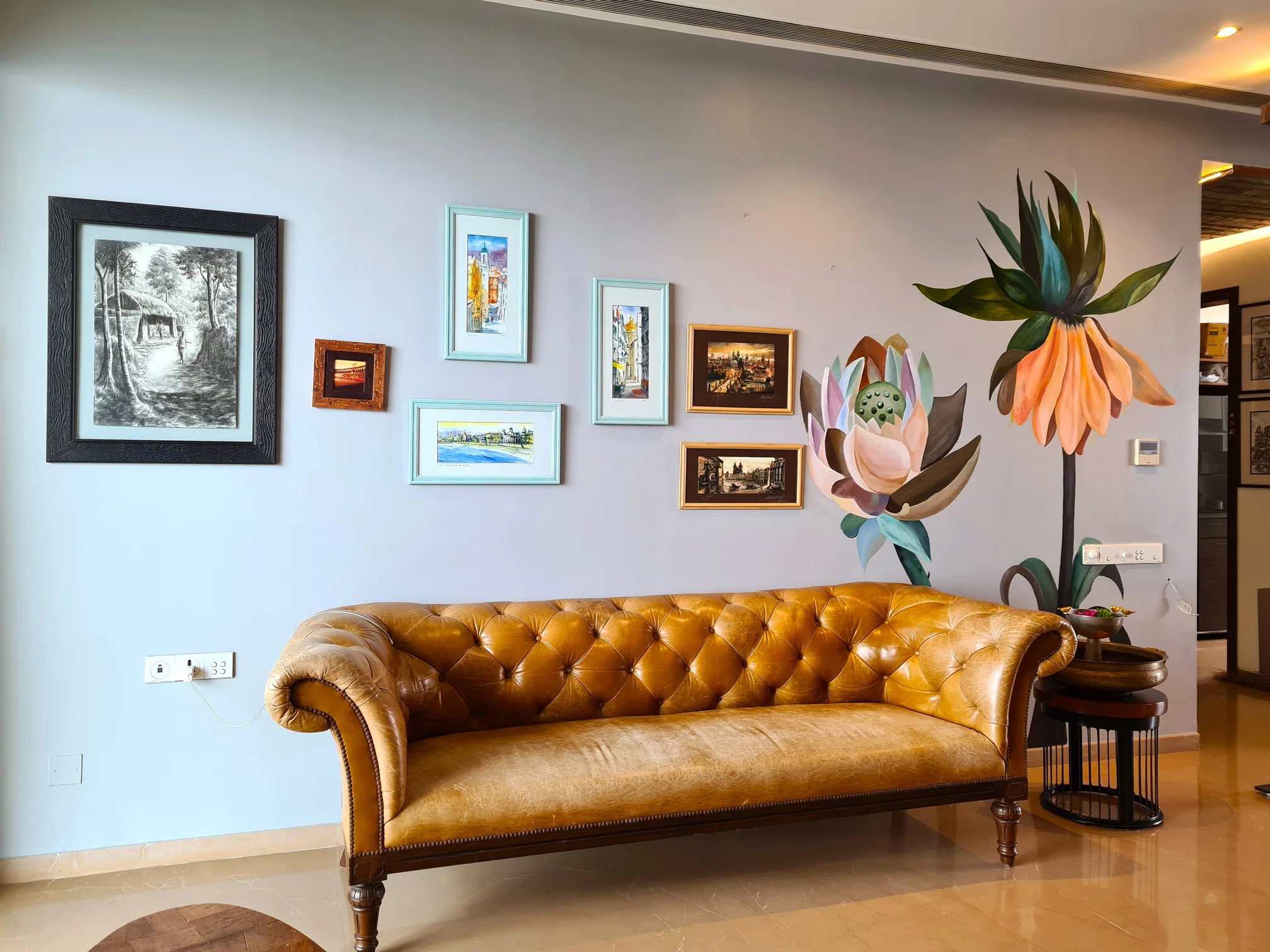 DESCRIPTION: A cluster of cherished memories and hand‑painted blooms transforms the living area into a living canvas.