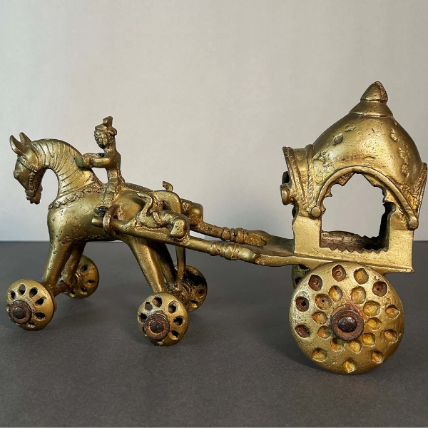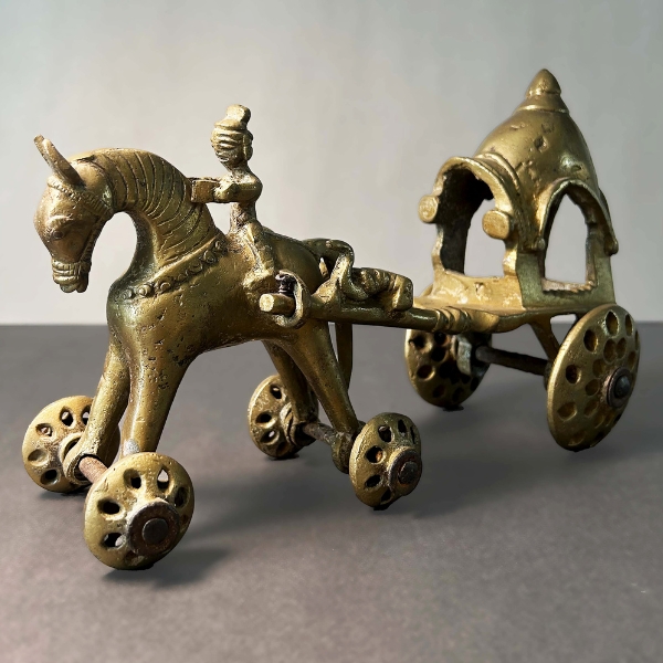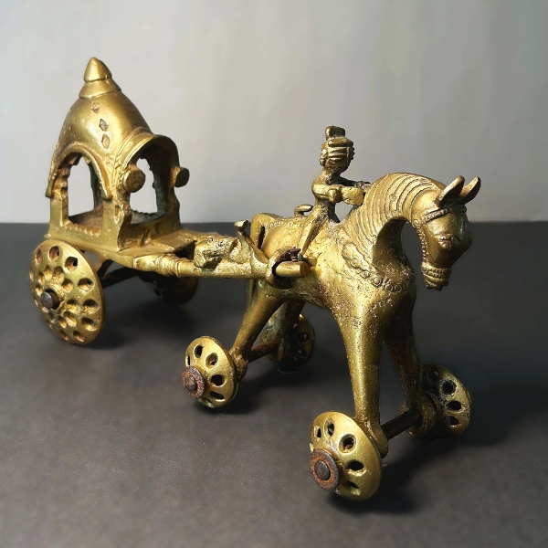 This intricately cast brass horse chariot captures the majesty and symbolism of ancient processions with a compelling sense of movement and dignity. Featuring a regally poised horse in full stride, the sculpture is led by a detailed figure at the reins and an ornate chariot canopy trailing behind on finely spoked wheels.