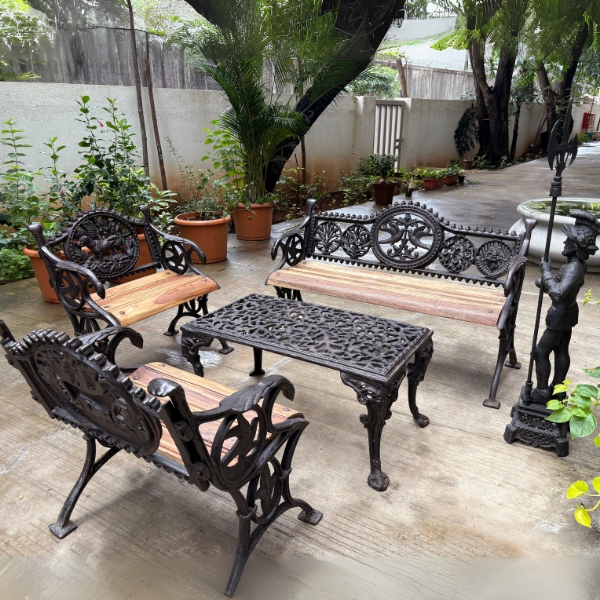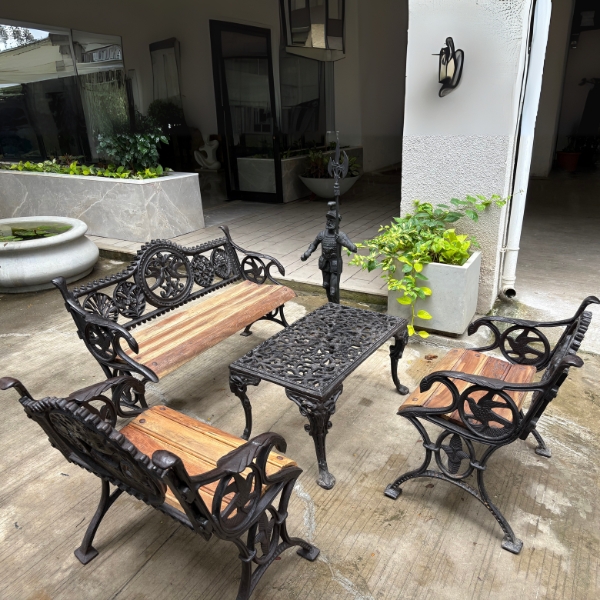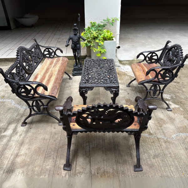 This outdoor seating ensemble feels less like furniture and more like an open-air gallery. Anchored by a three-seater bench, two single chairs, and a low rectangular table, it blends craftsmanship and storytelling into a space that invites both rest and admiration.
