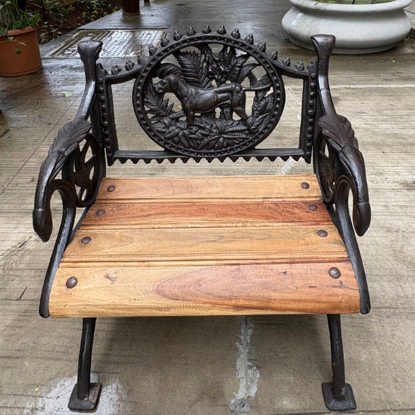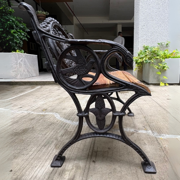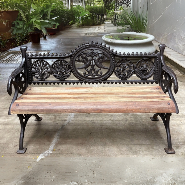 The three-seater’s backrest is a marvel of cast iron artistry: a sequence of circular medallions, each with its own motif, crowned in the center by a mirrored design of swallows mid-flight, framed by lush foliage. The symmetry is soothing, the birds poised as if in eternal conversation across the wrought leaves. Wooden slats form the seat, their warm, weathered grain playing against the dark iron, creating a balance of comfort and strength.