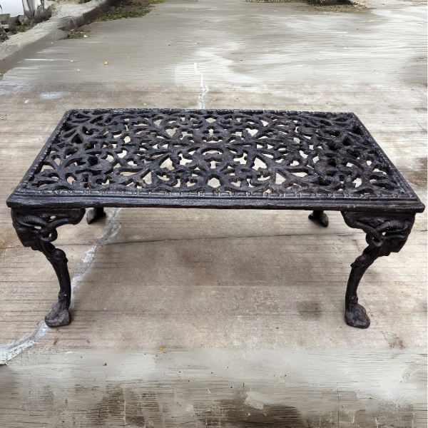 Between them rests the centerpiece table, its surface a tapestry of mirrored floral patterns. The design is open yet intricate, a lacework of iron that casts delicate shadows when the sun finds it.